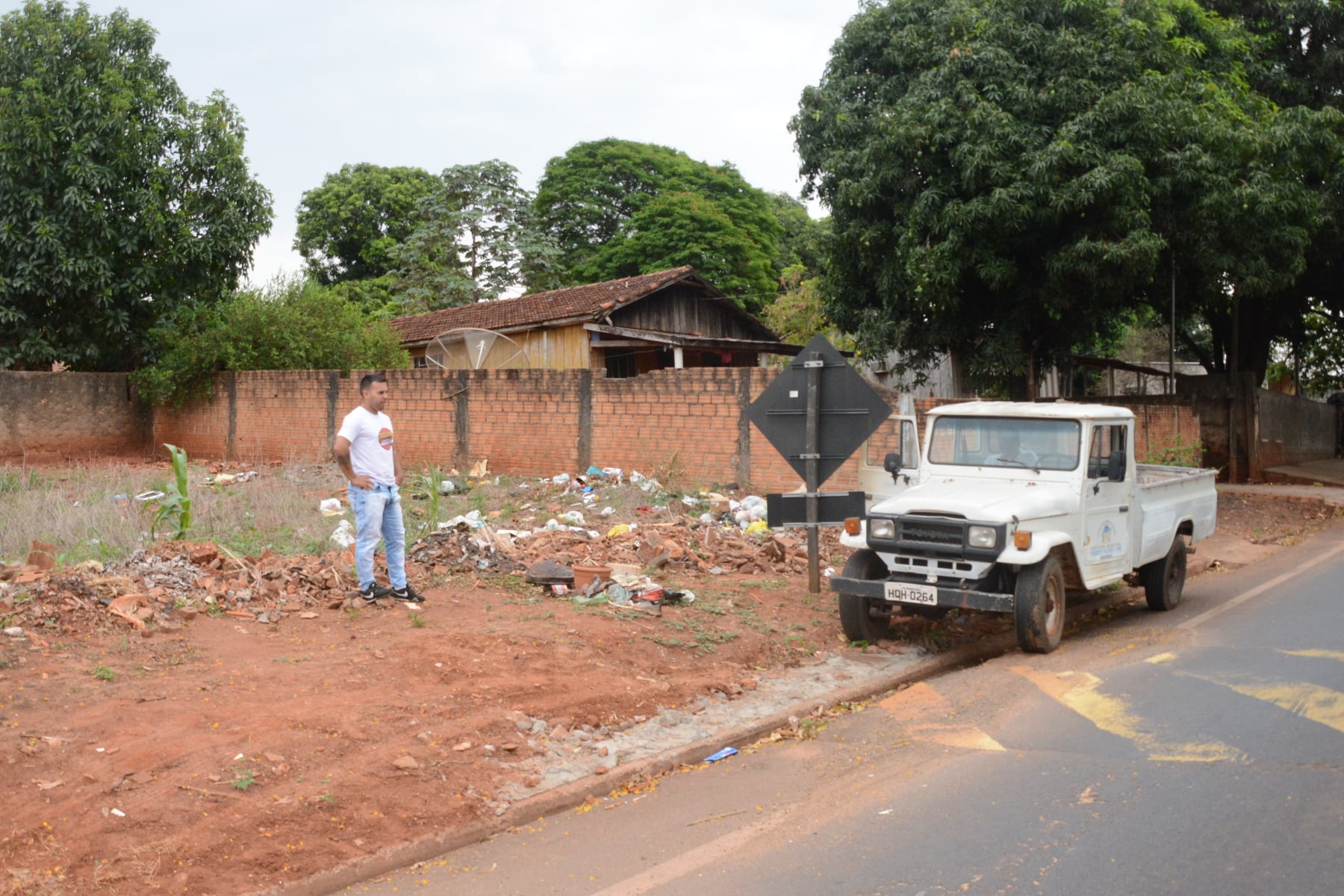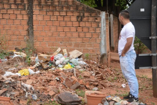 #PraCegoVer – Imagens desta quinta-feira, com agentes de Endemias verificando quintal em mal uso de conservação, com lixos domésticos expostos.