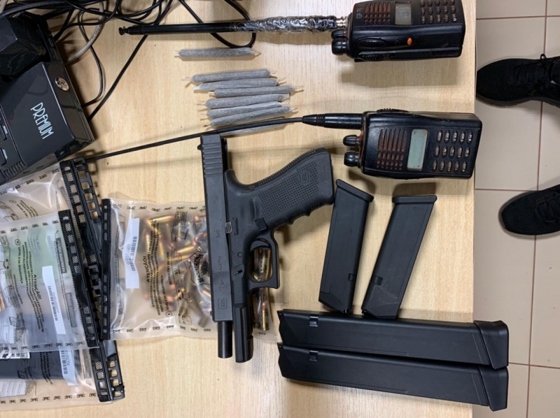 Durante a busca pessoal, os policiais encontraram uma pistola Glock G17, calibre 9mm, além de 84 munições do mesmo calibre que estavam acondicionadas em 2 carregadores alongados e 2 carregadores padrão. Foram encontrados ainda, uma porção de substância análoga a maconha e 2 rádios HTs.