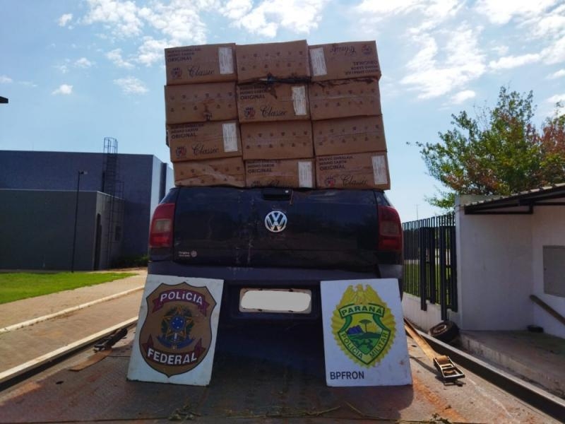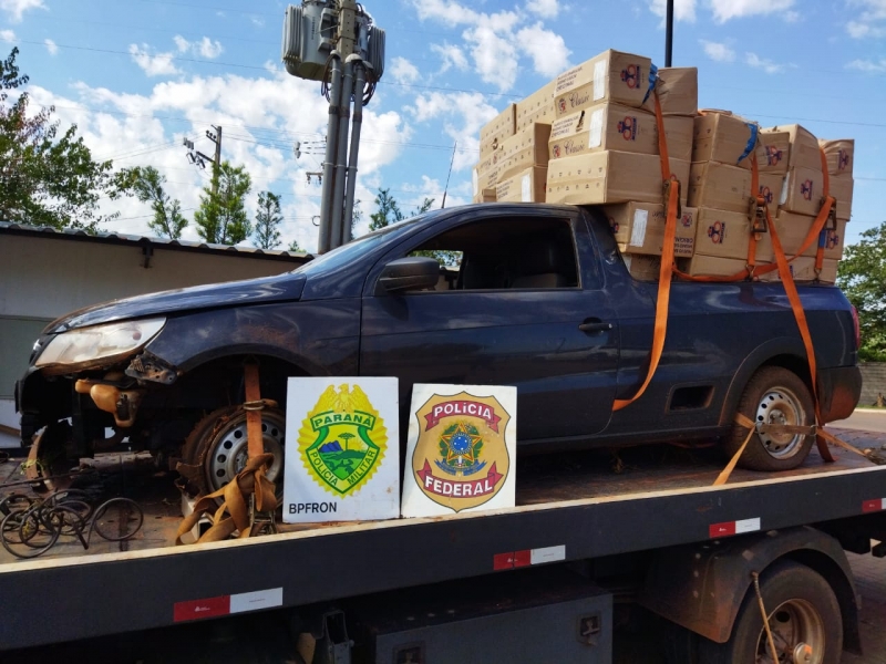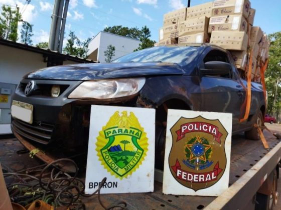 Na noite de quarta-feira (09/02), em ação integrada, policiais do BPFRON-PMPR e Policiais Federais realizavam patrulhamento na zona rural de Guaíra, quando perceberam movimentação suspeita de veículos transitando em alta velocidade e com carga de cigarros aparente. Ao se aproximarem para efetuar a abordagem, um veículo VW/Saveiro de cor cinza, empreendeu fuga. Quando o motorista percebeu que seria abordado, abandonou o veículo e correu em meio a mata fechada, não sendo possível localizá-lo. Em vistoria ao automóvel, foi constatado que estava carregado com aproximadamente 50 caixas de cigarro de origem estrangeira