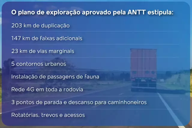 O novo contrato, com base no PER (Plano de Exploração da Rodovia), prevê a realização de um conjunto de obras e melhorias ao longo da BR-163 em Mato Grosso do Sul, incluindo 203 quilômetros de duplicação, 147 quilômetros de faixas adicionais, 23 quilômetros de marginais, cinco contornos urbanos, passagens de fauna, rede 4G em toda a extensão da rodovia, três pontos de parada e descanso para caminhoneiros e a instalação de diversos dispositivos operacionais, como rotatórias, trevos e acessos.