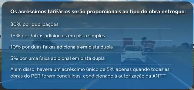 A reclassificação tarifária também foi detalhada: a tarifa poderá ser acrescida em 30% para trechos duplicados, 15% para faixas adicionais em pista simples, 10% para duas faixas adicionais em pista dupla e 5% para uma faixa adicional em pista dupla. Além disso, o contrato prevê um acréscimo único de 5% nas tarifas de todas as praças de pedágio após a conclusão de todas as obras previstas no PER. No entanto, esse reajuste final depende de autorização expressa da ANTT e da comprovação do cumprimento de todas as metas pela concessionária.