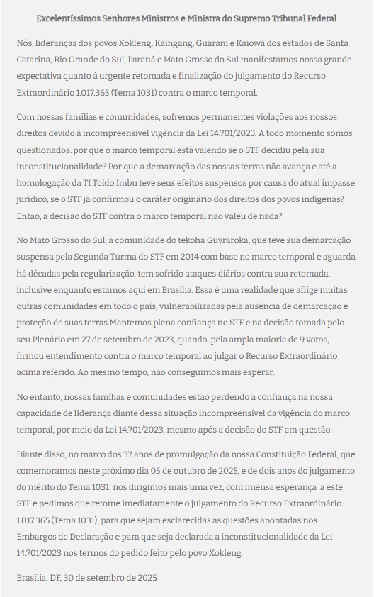 “No marco dos 37 anos de promulgação da nossa Constituição Federal, que comemoramos neste próximo dia 05 de outubro de 2025, e de dois anos do julgamento do mérito do Tema 1031, nos dirigimos mais uma vez, com imensa esperança  a este STF e pedimos que retome imediatamente o julgamento do Recurso Extraordinário 1.017.365 (Tema 1031), para que sejam esclarecidas as questões apontadas nos Embargos de Declaração e para que seja declarada a inconstitucionalidade da Lei 14.701/2023”, reivindicam os indígenas.